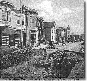 ENGINE NO. 6 AND HIS MEN Immediately after the first shake of the earthquake the doors of our Engine House [311 Sixth between Folsom and Shipley streets], shook open and all of our horses ran out into the street and escaped. It was with great difficulty that we got our apparatus out of the station, the floor being parted in the middle and the back of the house settled about three feet or more. Our first rescue was on both sides of the Engine House. At No. 313 Sixth St., the floor being parted in the middle and the back of the house settled about three feet or more. Our first rescue was on both sides of the Engine House. At No. 313 Sixth St., the place was completely wrecked and the bare foot of a child could be seen in a pile of debris. [This was the home of an on-duty firefighters from the station.] We cut our way into the premises with axes and shortly afterwards rescued three little children and five adults; at 309 Sixth St., the house was still standing but seemed to be in a dangerous condition, having partly caved in. The tenants consisting of three men, two women and three children were also rescued by my men. The old familiar cry of fire was heard and turning our eyes from our work we beheld threatening flames rising from different directions. My crew was then divided into two squads; one half to fight the flames and the other half immediately proceeded to remove the people injured in their homes. We then proceeded to clean away a perfect net of electric wires which had fallen into the streets. Coupling our Engine to the hydrant located on Sixth St., between Folsom and Clementina streets, we found it impossible to obtain any water from this hydrant and our Engineer not abandoning all hopes of obtaining it, made connections and succeeded in drafting the water left in this broken main. We immediately coupled on another line, and our combined efforts were awarded by being able to stop the fire from crossing Sixth St. At this time my crew helped rescue a man and woman from the Corona House [on the northwest corner of Sixth and Folsom], approximately forty people were killed by the collapsing of this hotel. The two survivors rescued were pinned on the top floor near a skylight. Our crew after chopping away the debris was able to remove these people from the ruins. Our water supply gave out and the fire was then raging around our Engine. It would have proved fatal for us then to stay here any longer and with wet sacks around our heads we assisted our Engineer to uncouple his apparatus and pull the Engine by hand along Folsom St., and stopping occasionally we tried to obtain water from the sewers, only to find them dry or filled with mud; finally on Fifth Street, we succeeded in drafting a small amount of water from a sewer and hopelessly tried once again to fight the fire but the flames had crossed at Fifth and Folsom streets. At this place we made a desperate attempt to save our hose but the heat became so intense that it proved impossible; and to save our Engine we had to move westward, and abandon our hose in the middle of Fifth Street between Folsom and Clementina streets. No more water could be obtained so we started in lifesaving by carrying people out of houses to places of safety.