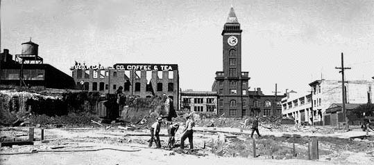 Demolition of the block bounded by Second, Stillman, Third and Perry streets, in mid-July 1935. This view shows Second Street, from Stillman (right) to Perry. The George W. Caswell coffee warehouse is nearly demolished to make way for the Bay Bridge viaduct. The viaduct ripped out six blocks of San Francisco's South of Market district, in the area now called Multimedia Gulch. Though many of the buildings appear old, all were built following the 1906 earthquake 29 years earlier. The Schmidt Lithography Co. clock tower still stands, though remodeled, on Second Street.